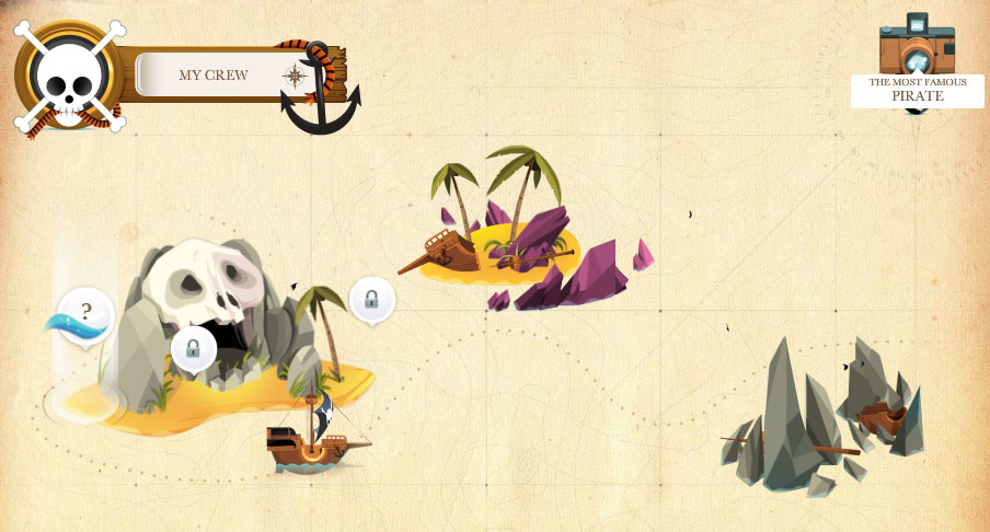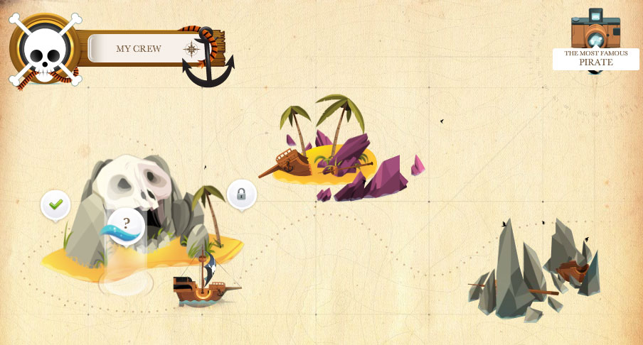 ①プレイを始めると、島と船が現れます。まずは、「?」の箇所をクリックします。
