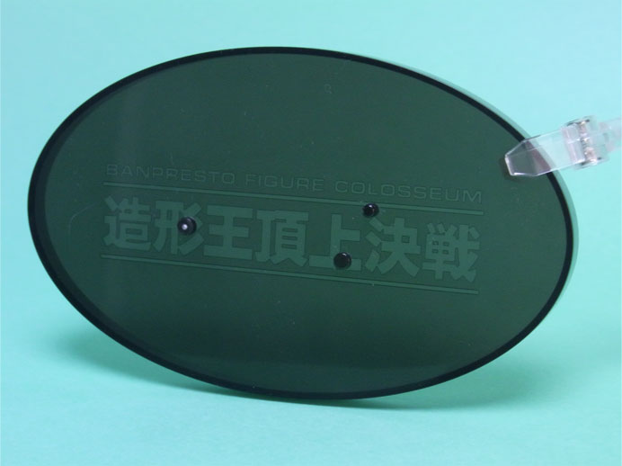 黒のクリアパーツ。裏面から文字が彫られ、表から見ると「造形王頂上決戦」の文字が浮かび上がる洒落た仕様になっています。同じく黒(不透明)の楕円形である「THE GRANDLINE」シリーズよりはデザイン性が良くなっていますが、楕円の長径はより長くなって無駄にでかいです。