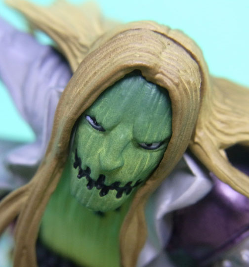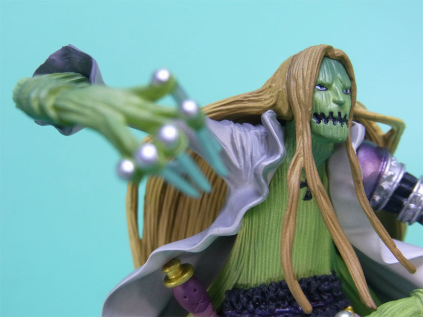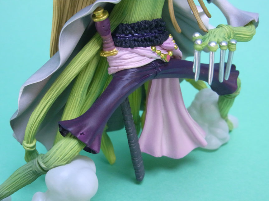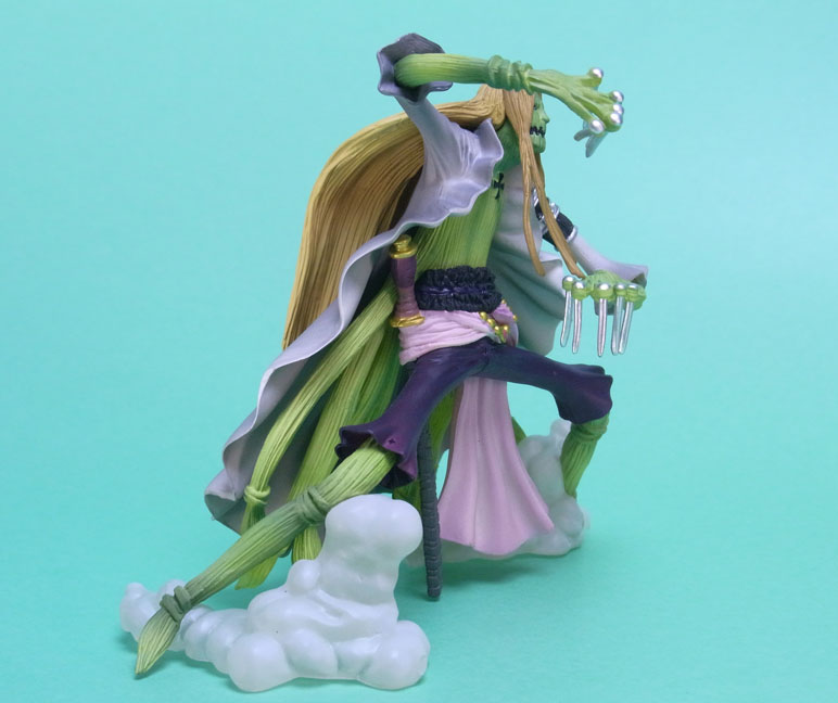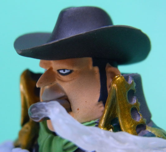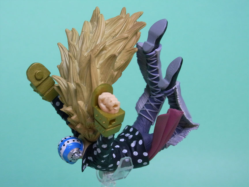 藁」に関連していることは間違いなく(→”ワラワラの実”?)、この能力は体が藁で覆われた状態になっていると考えられます。したがって、色はちょうどこの前髪と同じようなベージュ色が相応しく、一方、前髪はホーキンス本来のもっと明るい金髪というのがオリジナルのカラーリングのはずで、TVアニメではそのようなカラーリングが採用されています。しかし、このフィギュアはどういうわけか緑色ですw