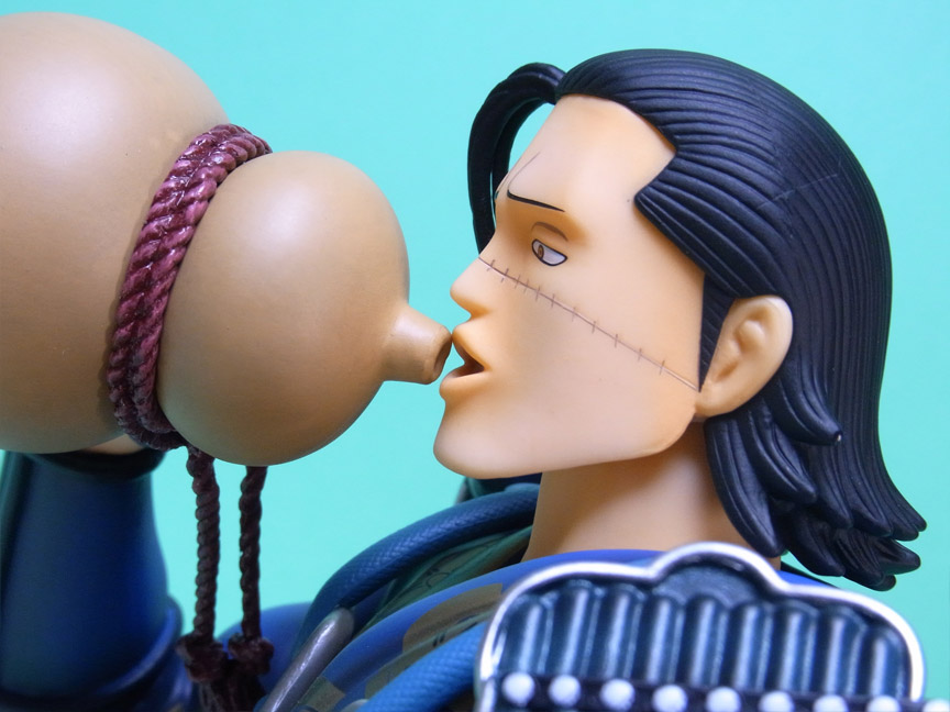 角ばった輪郭や目・眉など概ね似ていますが、皺が少ないため綺麗なクロコダイルといった印象です。口を窄めた珍しい表情なので余計にですが、横顔は頬がやたらと広く感じます。前髪の触覚は絶妙なバランスのためか、思いのほか違和感を感じません。頭部はボールジョイントで、顎をもう少し上げると再現度が高くなるのですが、後ろ髪が干渉してこれ以上上がりません。