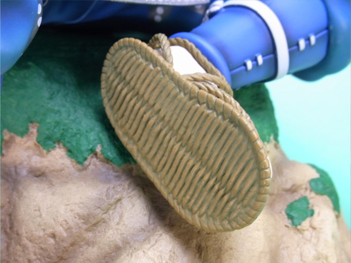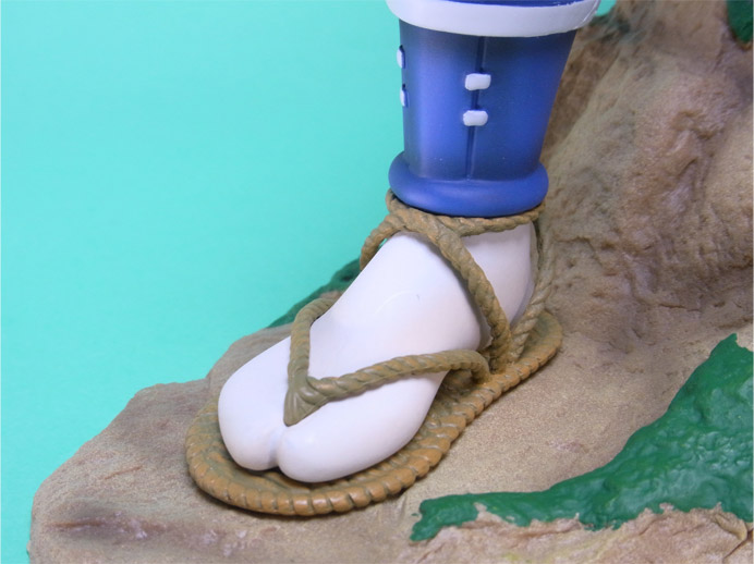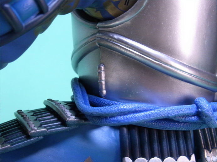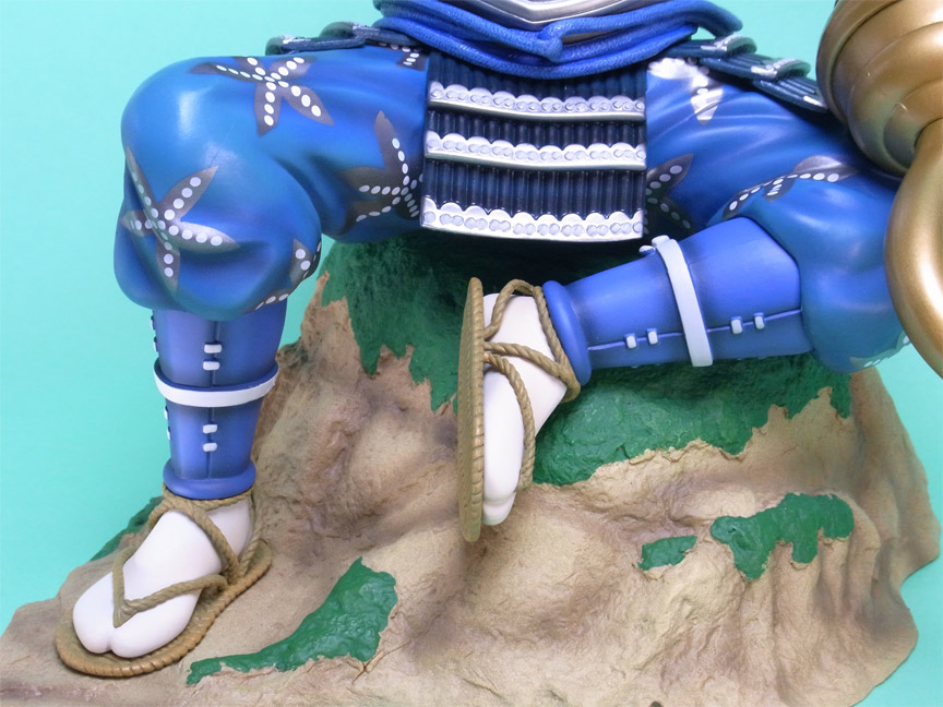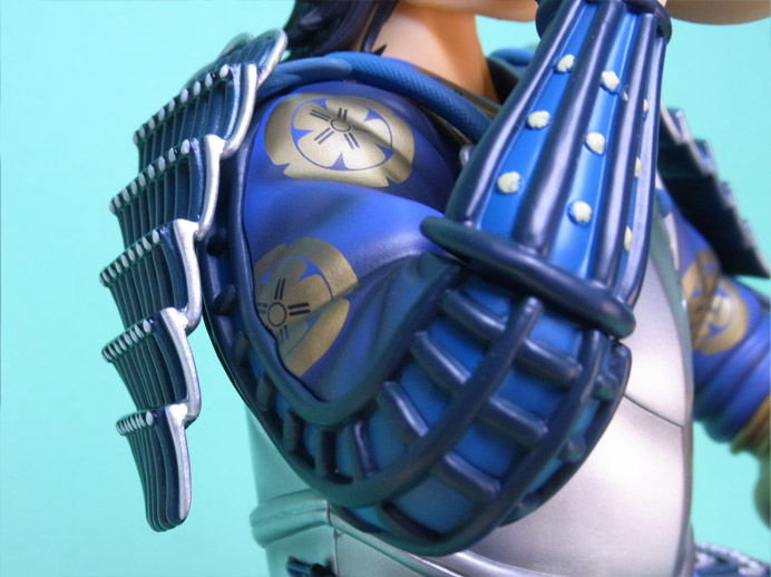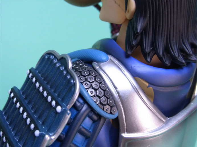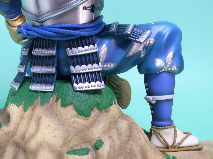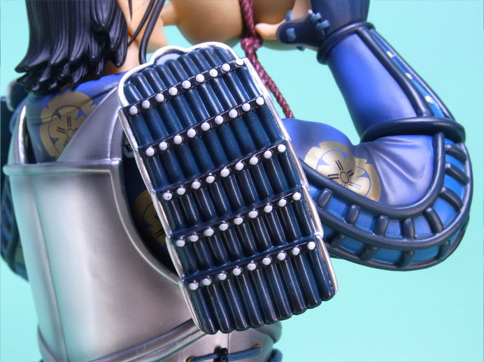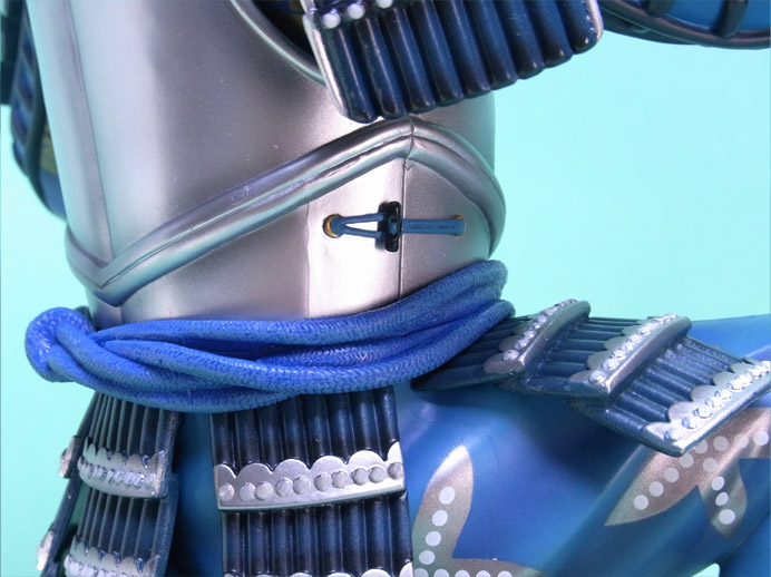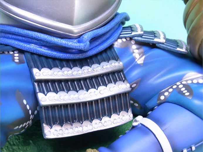 甲冑は細部まで忠実に再現。絵では見えないところまで、リアルに造り込まれています(→この甲冑は右側で開くタイプらしい)。腰に巻いてある縄も模様や結び目、たわみ具合などリアルです。
