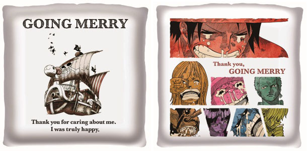 メリー号と麦わらの一味との別れの名シーンをデザインしたクッション。表面には最後に助けに来たメリー号、裏面には麦わらの一味それぞれの印象的な顔がデザイン。