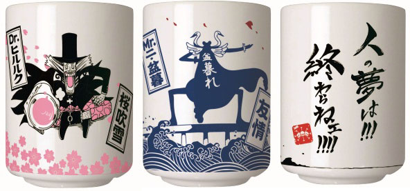 「ヒルルク」、「ボン・クレー」、「ティーチ」3人のそれぞれの名言がデザインされた湯のみ。