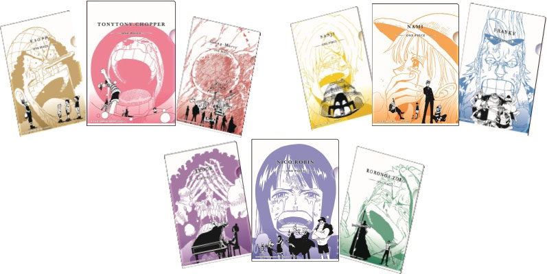 麦わらの一味とメリー号それぞれの名シーンがデザインされたクリアファイルのセット。