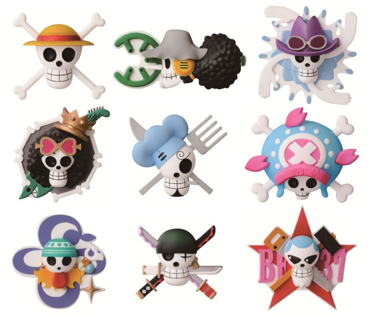 麦わらの一味それぞれの海賊旗がPOPなデザインで立体のマグネットになって勢ぞろい。