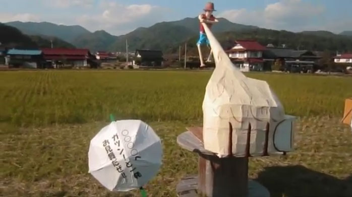 県道沿いの約800メートルに、「へのへのもへじ」の昔ながらの作品からアニメの主人公などのユニークなかかしまで計23作品が並んでいたそうです。