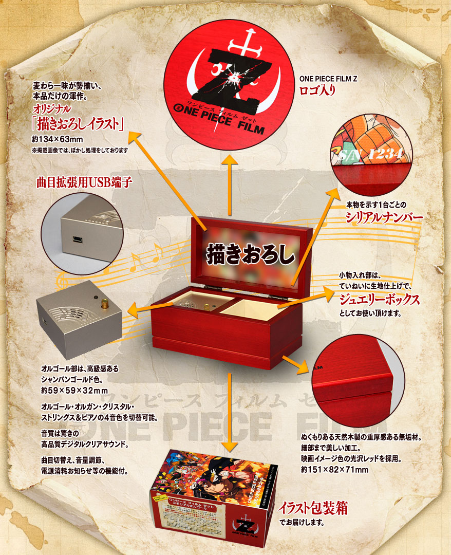 音楽の小箱」です。ぬくもりある木製で、映画イメージ色のレッドを採用、ボックス表面には「ONE PIECE FILM Z」ロゴ入りで、ジュエリーボックスとしてお使いいただけます。ボックスを開けると、麦わらの一味が勢揃いしたオリジナル「