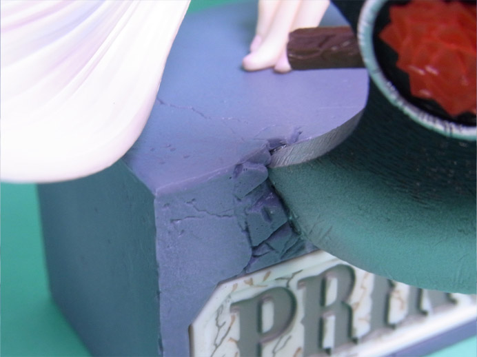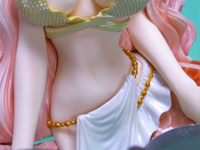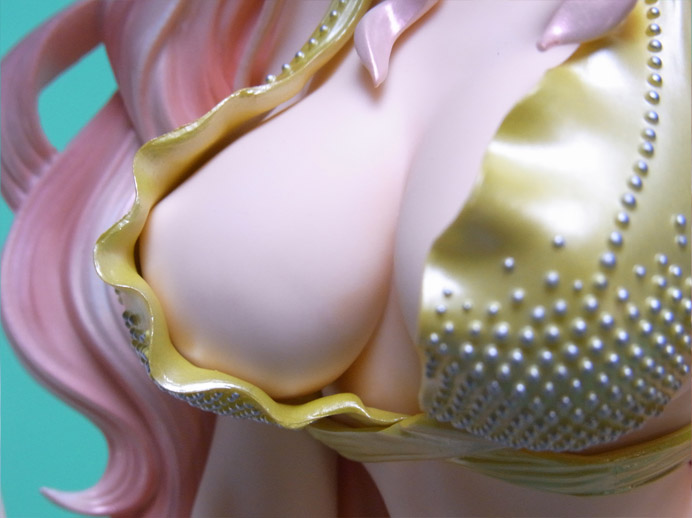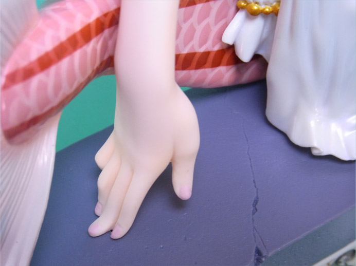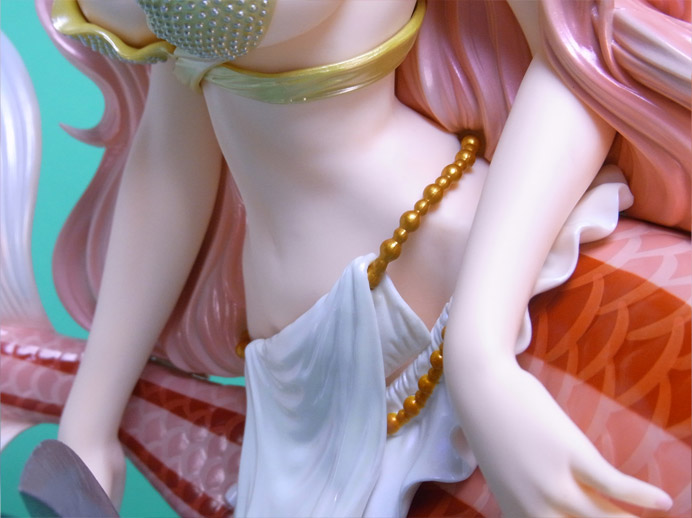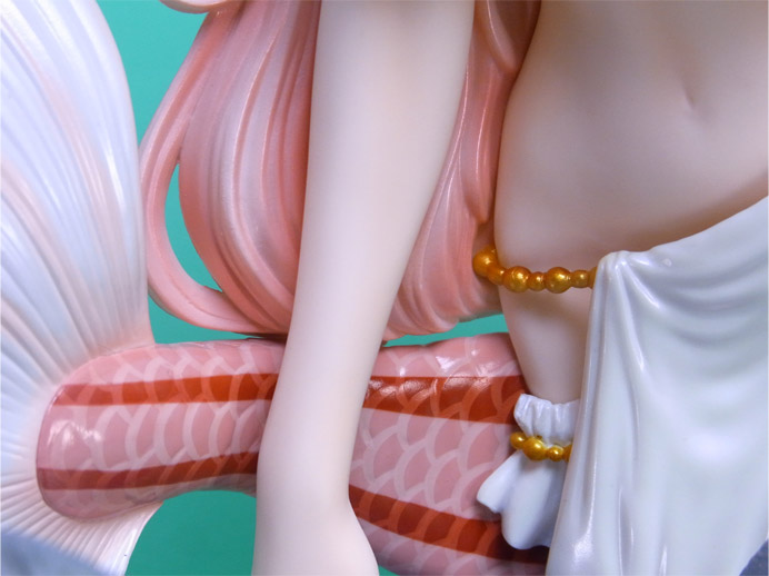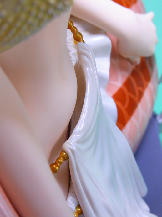 目立つパーティションは、羽衣の左右1箇所ずつ、左肩、鱗と髪の毛の間の計4つ。パーティションラインをなくすために、組み立てではなく一体型のパーツにすることで、これ以上価格が高くなっても困るので、ある程度はしょうがないです。ただし、