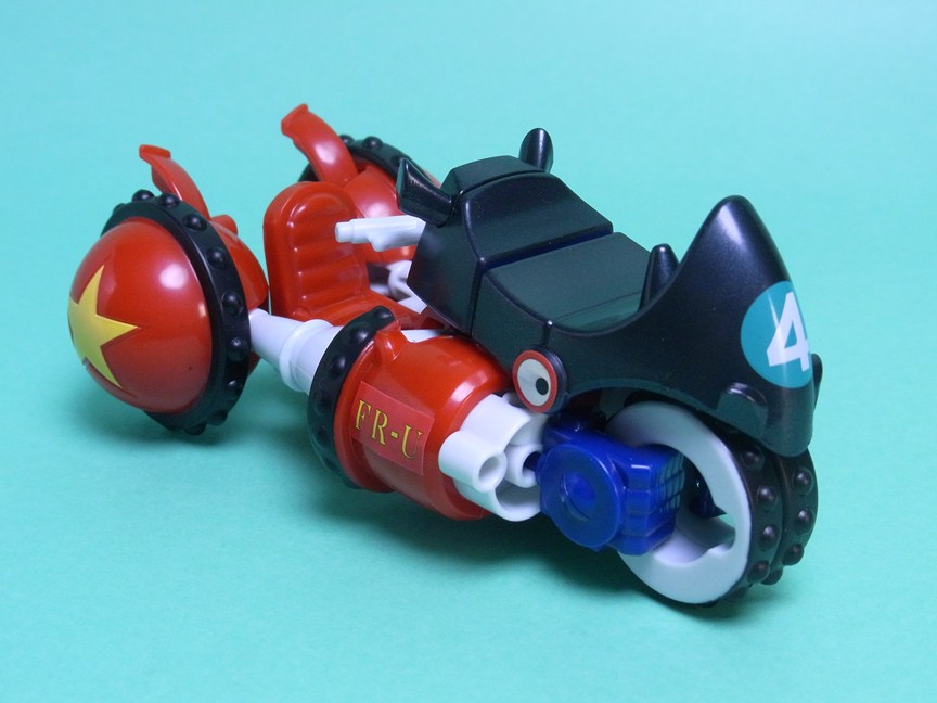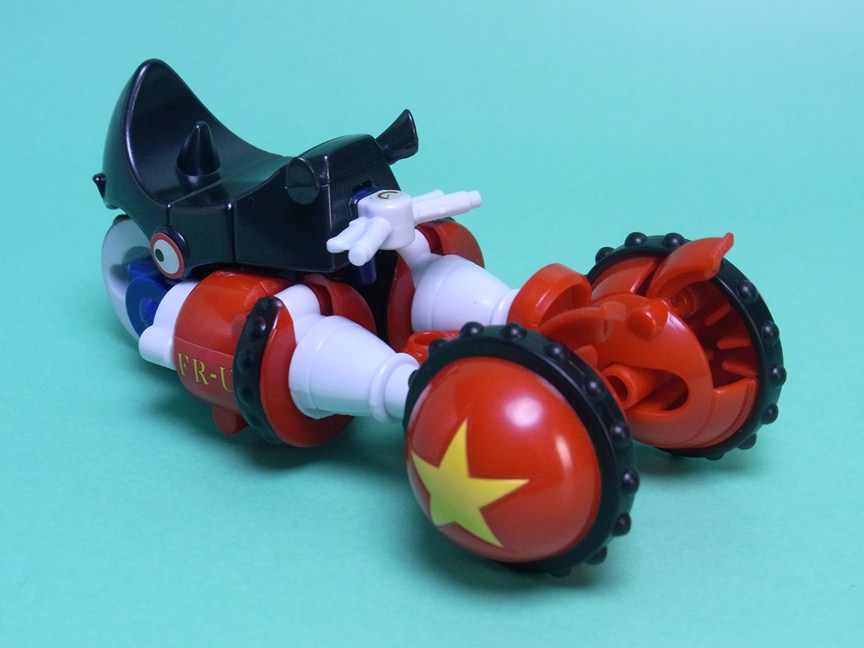 腕)という名前の通り、クロサイのヘッド部分を取るとほぼ腕の形になっています。実際の変態(変形)としては手首の部分にあったタイヤを腕にはめて、マフラー部分(後輪のウイングに見えるもの)を閉じます。あとは腕になるパーツを残してシートを外すだけです。
