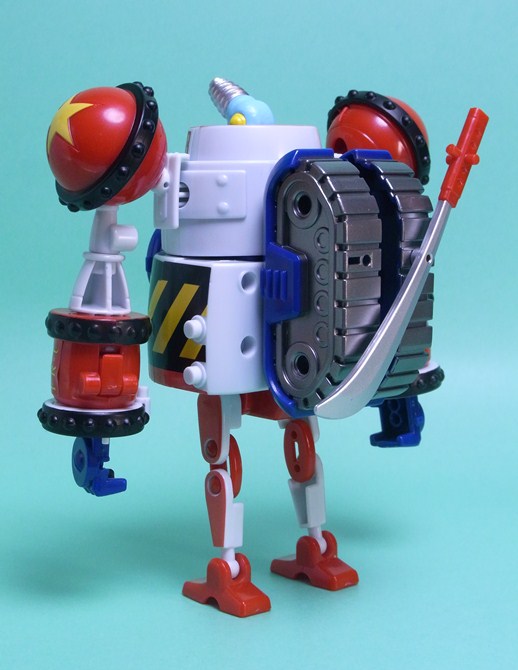 タンクの変態(変形)は恐竜の頭部がひっくり返って将軍の頭部に変わります。クルッとひっくり返って変形する原作と違い実際は分解する必要があるのですが、ただの付け替えではなく、ちゃんと頭部を収納しているところがいい感じです。他はキャタピラの取り付け位置を移し、コックピットの入り口部分(ドクロのマーク)をへっこませ、背部の将軍の脚パーツを伸ばしています。