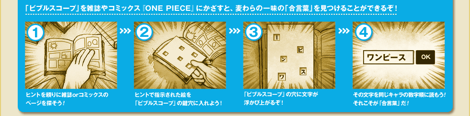 2億冊突破キャンペーンの企画の一つ。集英社が発行する雑誌に毎週1種の「ビブルスコープ」という穴開きのポストカードが付属しており、与えられたヒントをもとに雑誌や「ONE PIECE」コミックスの指定されたページの絵柄に「ビブルカード」を合わせると、”合言葉”が浮び上がります。この合言葉は複製原稿プレゼント(ビブルの秘宝)の応募に必要な合言葉になっている他、キャンペーン期間中限定公開されていたブラウザゲーム「ビブルクエスト」の一部キャラクターのアンロック条件のパスワードにもなっていました。
