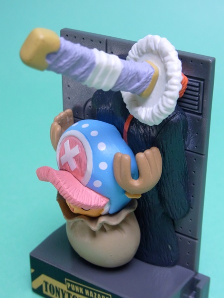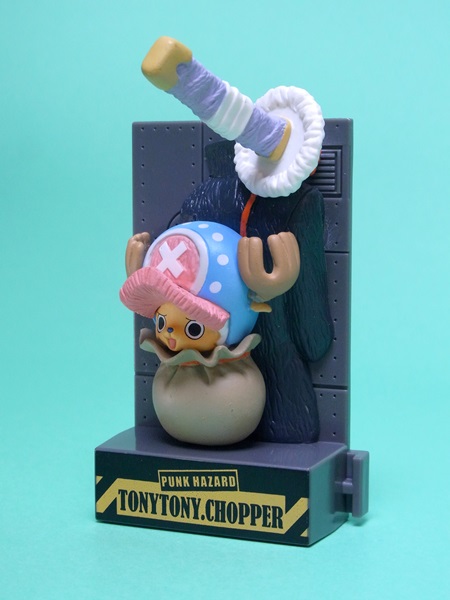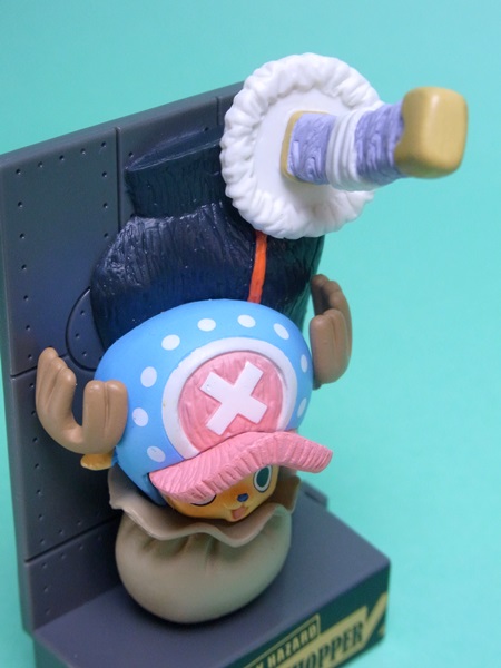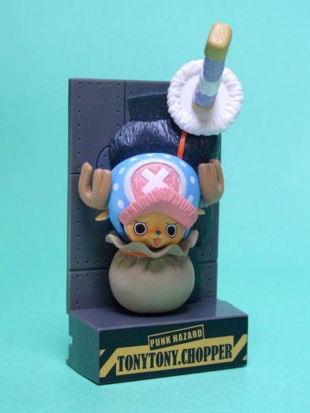 パンクハザード編、シーザーの研究所に潜入するため、袋に入ってローの刀に紐で吊るされたチョッパーを再現。チョッパー本体は高さ4.5センチです。