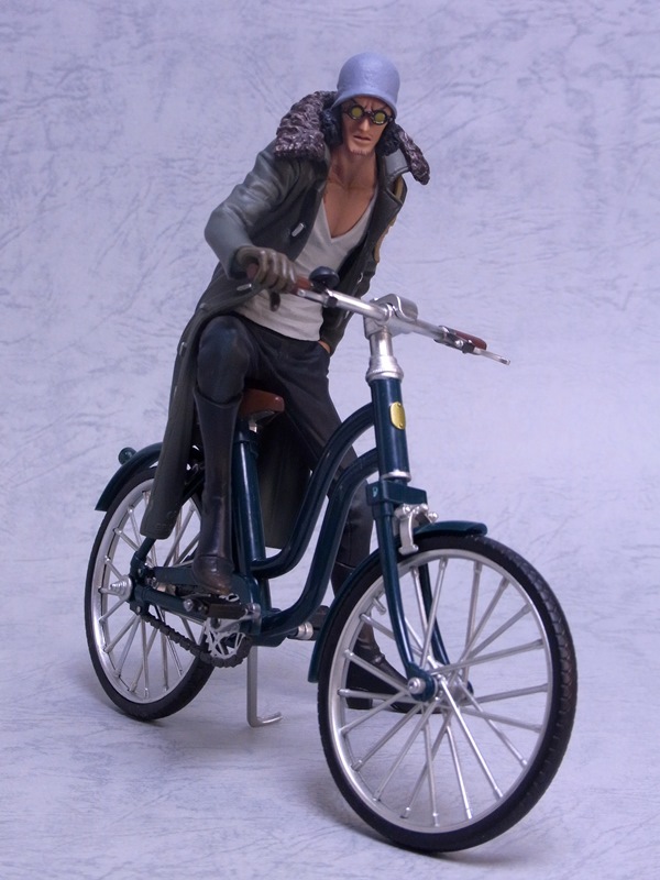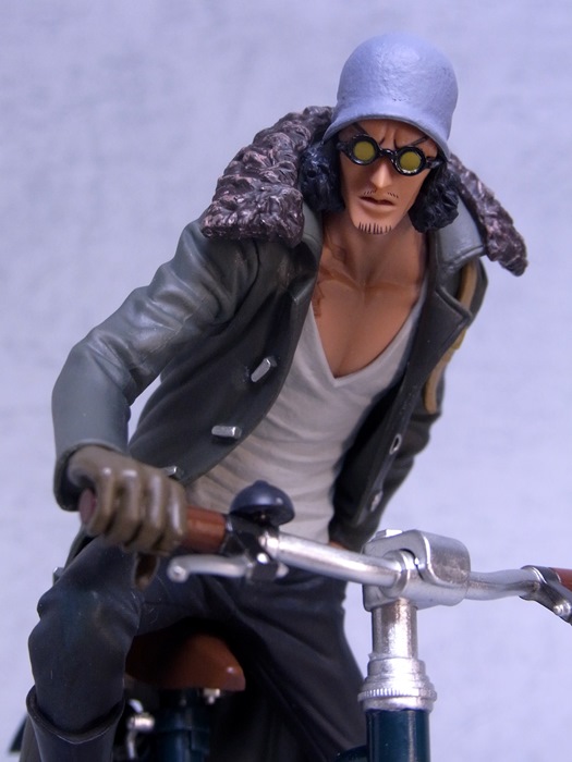 新世界編クザン。原作本編だと超ペンギンのキャメルに乗って登場したので、自転車に乗るクザンは今のところ映画「FILM Z」の再現になっています。これは個体差ではないと思うのですが、クザンと自転車の設計は微妙にずれており、右手をグリップに固定すると、どうしても