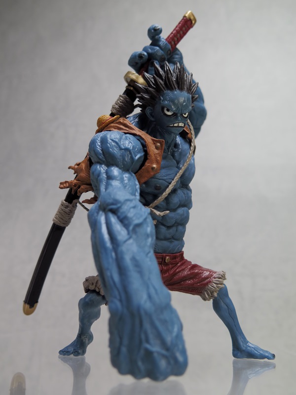 」。巨大化するわ、上半身が異常にビルドアップするわ、肌が青くなるわ、髪の毛が逆立つわ、眉毛ないわ、あと口調が変わるわ。海軍の手練れ剣士の影も入っているため剣術も使えるようになっており、どこから持ってきたか分からない大剣を背負っています。
