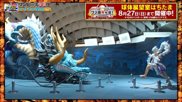 お台場冒険王2023」(7月22日〜8月27日)内のアニメ「ワンピース」の展示「ワンピース 討ち入り!ワノ国鬼ヶ島!in お台場冒険王」のスペースを間借りして行われており、背景にはワノ国編の最終決戦を再現したほぼ等身大のルフィとカイドウが対峙しています。番組セットとして捉えると物凄く豪華です。