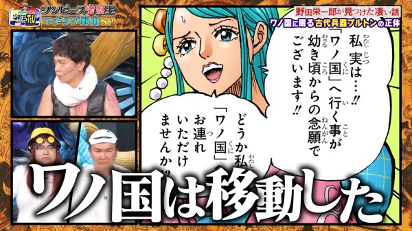 週刊少年ジャンプ作品史上初の地上波冠バラエティ番組「ワンピースバラエティ 海賊王におれはなるTV」の放送第36回。今回の放送はONE PIECE有識者達がONE PIECEの都市伝説(凄い話)をプレゼンするパネルトーク「ONE PIECE凄い話頂上決戦」の番外編でゲストにマヂカルラブリーのお二人が登場し、野田栄一郎こと