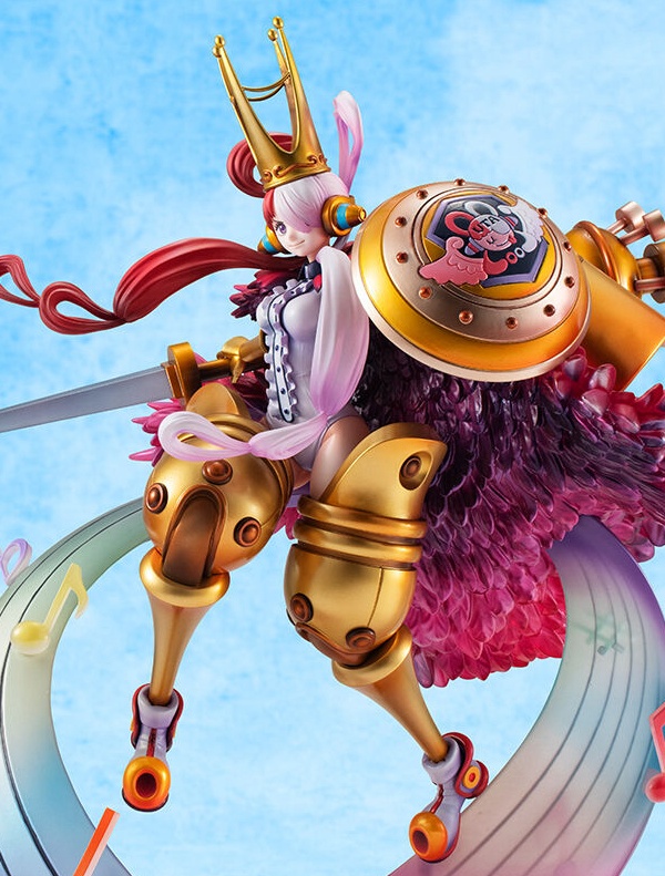 その力強い歌声と様々に変化する華やかな衣装で観客を虜にしたウタですが、今回は代表曲「私は最強」に合わせて身に纏った黄金の鎧姿で立体化。身の丈を超える武器を携え、まるで翼のようにマントを翻し、五線譜と共に自由に宙を駆けるウタの勇姿を、劇中でのイメージそのままに再現しています。鎧のディテールや衣装の質感、勇ましくも可愛らしい笑顔など細部まで見どころ満載。