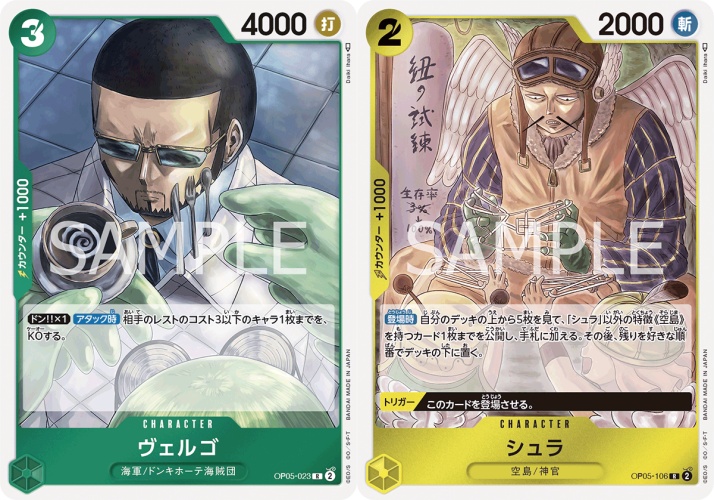 「シュラ」は5弾環境の環境デッキである黄エネルに採用されているため、よく目にするカードです。「ヴェルゴ」は今のところ使われていませんが、ブースター第6弾の新リーダー