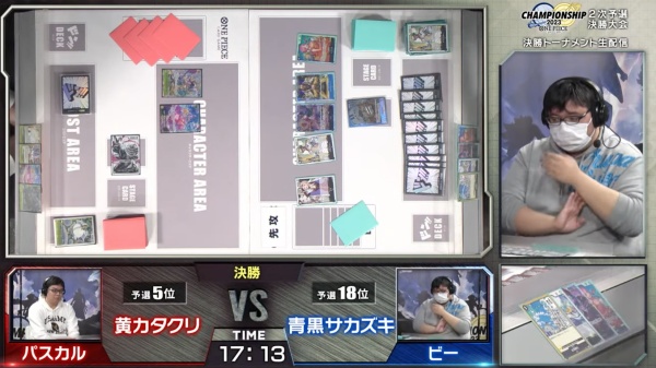 黄カタクリ側の最後のライフは神視点でも不明なので、トリガーで「お前が消えろ」や「ベッジ」が発動していれば、青黒サカズキ側にどのみち勝ち目はなかったわけですが、ワンピカード特有の攻防が見えた決勝でした。