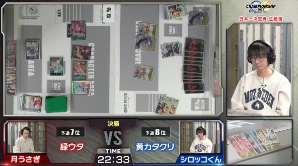 現環境の黄カタクリは8カタクリが通常採用されていないため、8キッドを除去する手段がないのがウタ対面では苦しいところです。さらに緑ウタは環境トップの青黒サカズキに対しては、「私は最強」を連打するだけで有利ですから、デッキの種類がかなり絞られる日本一決定戦において、緑ウタを握ったのは良い選択だったようです。