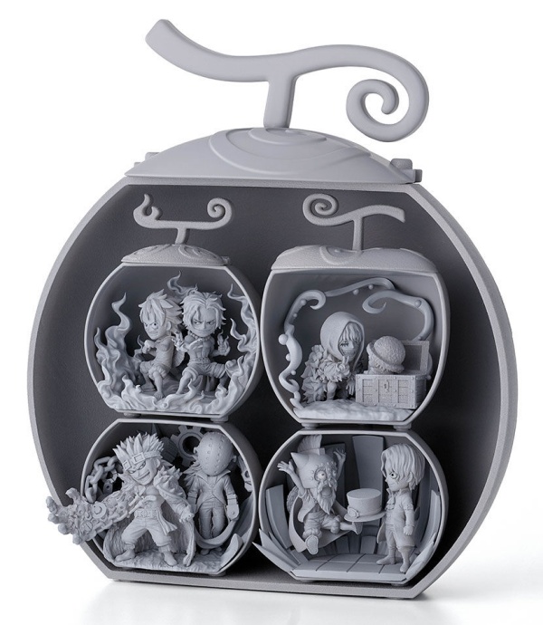 通常シリーズと異なり、カプセルの中にフィギュア2体が収められ、ジオラマでシーンが再現されている特別仕様となっています。これに至るまでに20案ほどがボツになっており、監修の集英社と東映アニメーションから「ワンピの実らしさとはなんなのかを突き詰めてほしい」という要望を受けたとのこと。多分、大きいサイズのワンピの実とかもあったのでしょうね。