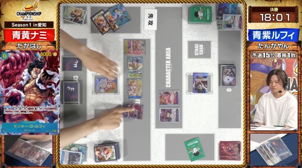 また、青黄ナミの先攻5ターン目もターニングポイントでした。6000のアタック2回を手札で守られた後、試合では8ルフィを置いてブロッカーのチョッパーをバウンスしているのですが、ここでは8キッドでライフトラッシュの方が間違いなく良かったように見えます。