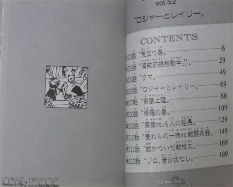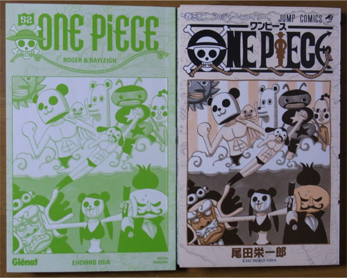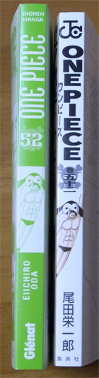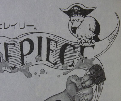 タイトルロゴのアレンジ。ルフィのシルエットになっている「I」は使用せず、「O」の中の麦わらの骸骨は外に出て、フォントも異なる。配色はグラデーションもなく黒になっており、全体的に上側に押し上げられているため、JCコミックスでは隠れていた表紙絵の部分が見える。