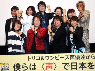[映画.com ニュース] 「週刊少年ジャンプ」の人気漫画「ONE PIECE」と「トリコ」を3Dで上映する映画「ジャンプHEROES Film トリコ3D×ONE PIECE3D」の舞台挨拶が3月29日、東京・丸の内TOEIで行なわれた。「声で日本を応援しよう」というメッセージのもと、「ONE PIECE」の中井和哉、岡村明美、山口勝平、平田広明、大谷育江、山口由里子や、「トリコ」の置鮎龍太郎ら声優陣が駆けつけた。