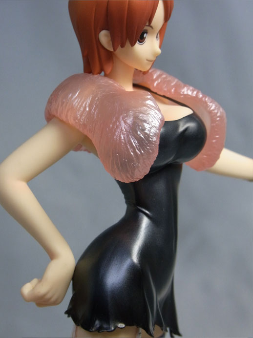 クリアパーツのファーとツヤ塗装のドレスのため、全体的に照かっている印象を与え、それがかえってエロカッコいい仕上がりとなっているフィギュアだなと感じました。エンディングver.のナミとの間にルフィとビリーを配置して飾ることにします^^v