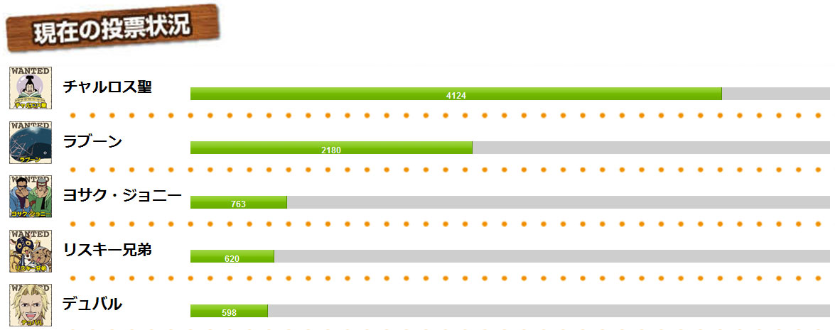 天竜人は人気のようで、シャルリア宮が10位(322票)、ロズワード聖が11位(310票)につけています。チャルロス聖に票を入れた人はこの2キャラクターも一緒に欲しいでしょうから、うまく票を分散できていれば(例えばチャルロス聖の票を1000票ずつ分散できていれば)、今頃4位以内に天竜人が3人入っていたかもしれません。PCと携帯で持っている台数分票があるので、投票をまだ行っていないPCもしくは携帯があればチャルロスに入れた人はシャルリア宮やロズワード聖に投票するといいでしょう。チャルロスがこれだけ票を伸ばしているので、仮に5位までに入らなくても他2人の天竜人はいずれ商品化されるんじゃないでしょうか・。・