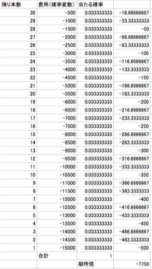 確率変数をくじを引いてかかる費用として期待値を計算し、くじが残り何本の状態でキッドが残っていれば確率的にオークションで落札するより好条件なのかを導き出します。