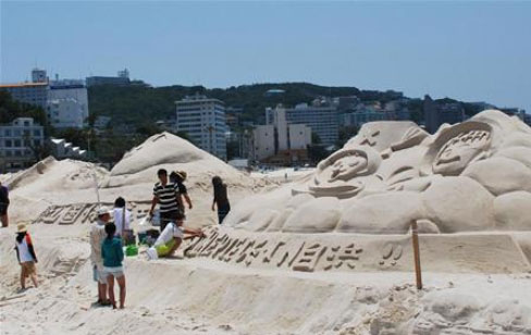 和歌山県白浜町の白良浜海水浴場で27日、「砂まつり大会」(白浜観光協会主催)が開かれ、20チーム計約500人が砂像造りに汗を流した。