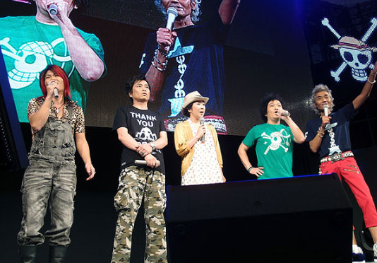 続いてオープニングアクトとして、きただにひろしさんが登場! TVアニメ『ワンピース』の主題歌である『ウイーアー!』を熱唱し、ステージは早くも熱気に包まれた。引き続きMCも担当するきただにさんの導きで、サンジ役の平田広明さん、ウソップ役の山口勝平さん、ネフェルタリ・ビビ役の渡辺美佐さん、そして“矢尾ちゃん”ことフランキー役の矢尾一樹さんが現れると、一気に歓声が巻き起こった。